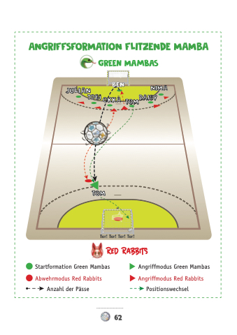 ANGRIFFSFORMATION FLITZENDE MAMBA Green Mambas NIMA TobiOKKA TOMDAISY JULIAN Startformation Green Mambas Abwehrmodus Red Rabbits Anzahl der Pässe Angriffmodus Green Mambas Angriffmodus Red Rabbits Positionswechsel TOM Tor! Tor! Tor! Tor! Red Rabbits 62