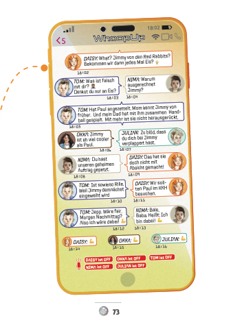 73 5 WhoopUp 18:05 18:02 DAISY: What? Jimmy von den Red Rabbits? Bekommen wir dann jedes Mal Eis? TOM: Was ist falsch mit dir? Denkst du nur an Eis? NIMA: Warum ausgerechnet Jimmy? OKKA: Jimmy ist eh viel cooler als Paul. JULIAN: Zu blöd, dass du dich bei Jimmy verplappert hast. NIMA: Du hast unseren geheimen Auftrag gepetzt. DAISY: Das hat sie doch nicht mit Absicht gemacht! 18:08 18:09 18:03 18:04 TOM: Hat Paul angezettelt. Mom kennt Jimmy von früher. Und mein Dad hat mit ihm zusammen Hand- ball gespielt. Mit mehr ist sie nicht herausgerückt. 18:06 18:07 TOM: Ist sowieso Rille. Weil Jimmy demnächst eingeweiht wird DAISY: Wir soll- ten Paul im KKH besuchen. TOM: Jepp. Wäre fair. Morgen Nachmittag? Also ich wäre dabei! NIMA: Bale, Baba. Heißt: Ich bin dabei! DAISY: 18:14 OKKA: 18:15 JULIAN: 18:16 DAISY ist OFF OKKA ist OFF TOM ist OFF NIMA ist OFF JULIAN ist OFF 18:10 18:11 18:12 18:13 18:02